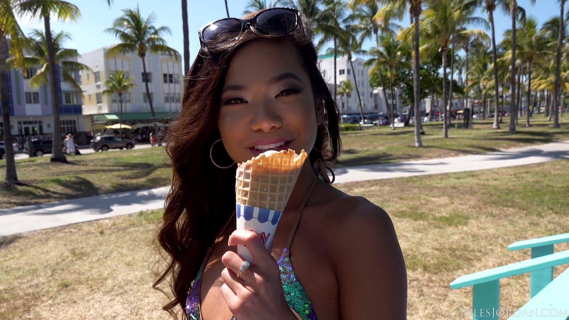 While Jules is wandering around South Beach he notices a hot babe eating an ice cream cone so he goes to investigate.