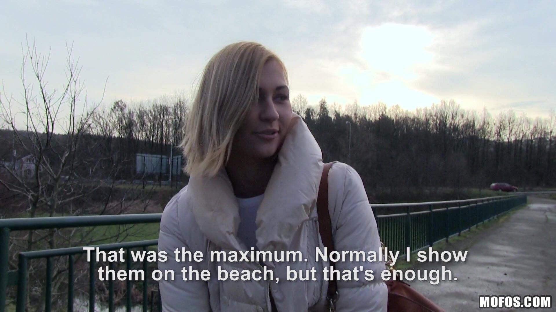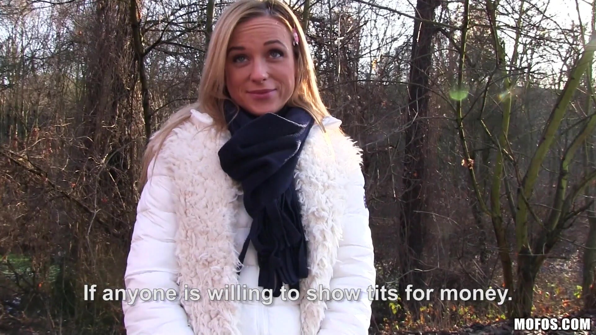 Flashing her tits for cash might not be what Cristal Caitlin had in mind when she said she was looking for a job, but times are tough and she's horny, so it'll have to do. This Euro blonde is shy at first, but once she sees the cash, she is all in!