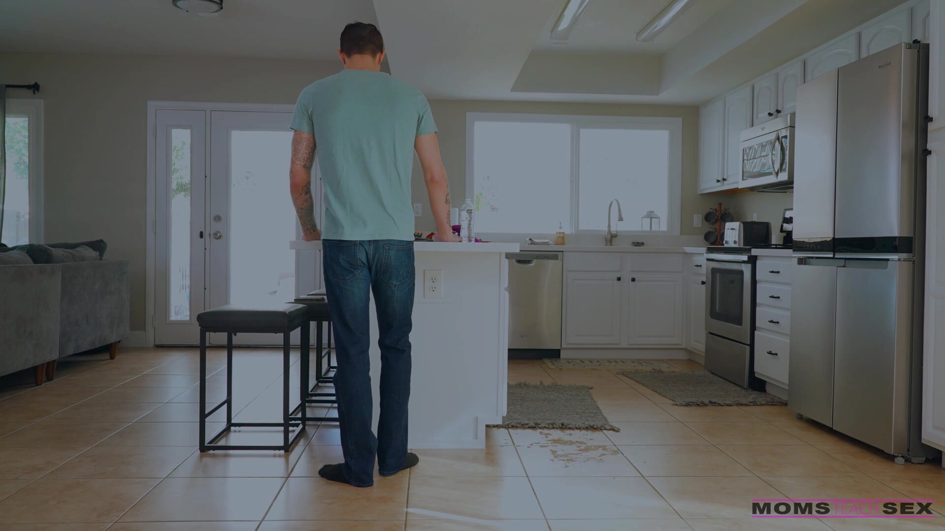 Aiden Ashley is trying to get along with her stepson, Jayden Marcos, but Jayden can only see how hot Aiden is. She catches him staring at her and doesn't say anything. Instead, she walks over to the counter and spills water all over herself. She has Jayden try to dry her off so she can feel his hands on her body. Then she tells Jayden that it's not working and he has to turn around so that she can get changed for a shower.